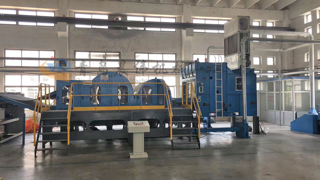 2. CWKS-開松機(jī):各種不同纖維被放入水平輸送簾,經(jīng)壓棉輥和對輥羅拉喂入,經(jīng)高速打手開松后經(jīng)輸棉風(fēng)機(jī)以適量的風(fēng)量輸送纖維原料供后道工作使用;并配備橋式除鐵裝備。開松效果好,不易纏棉,產(chǎn)量高。